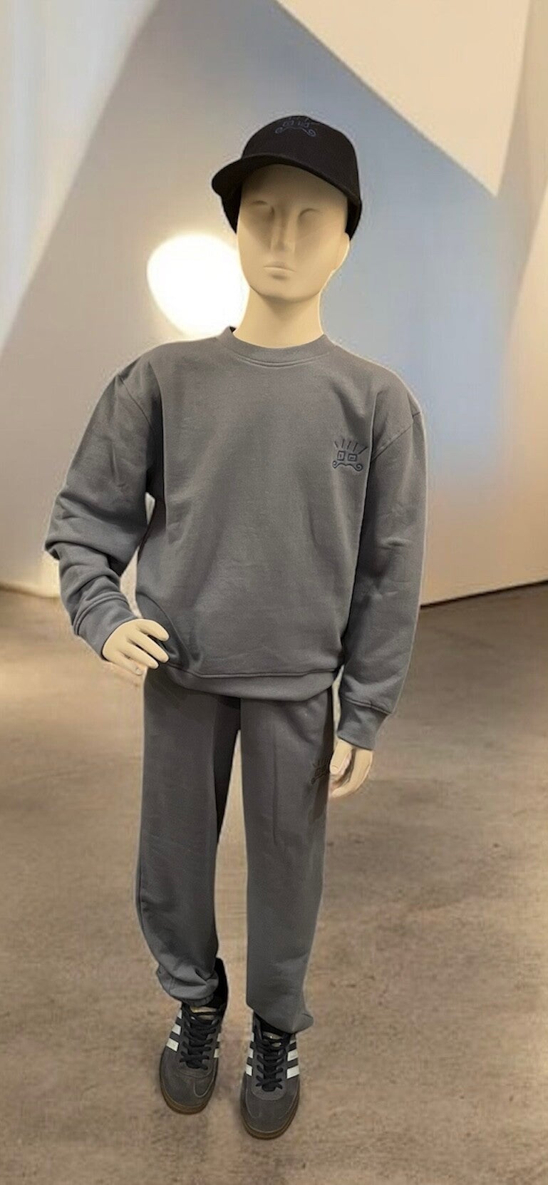 Borduring vooraan onder de broekzak. De grijze broek heeft onderaan geen rekje = recht model. De khaki en de blauwe broeken hebben onderaan wel een rekje.